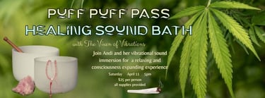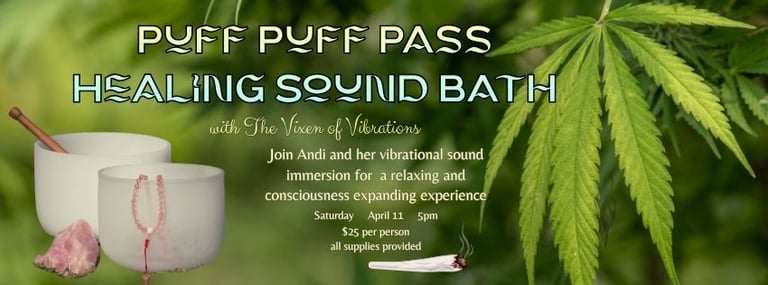 Immerse yourself in smoke and sound with The Vixen of Vibrations and her Crystal Singing Bowls. Feel yourself uplifted, enlightened, and deeply relaxed. Enjoy some tea from Mystic Crossroads and Cannabis Cigarettes and open yourself to the experience.